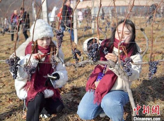 鴨綠江河谷冰葡萄進(jìn)入最佳采摘時期,游客在采摘冰葡萄。