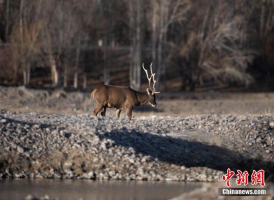 2023年1月24日,西藏拉薩市達孜區(qū)幫堆鄉(xiāng)附近,白唇鹿在拉薩河畔覓食。中新社記者 貢嘎來松 攝